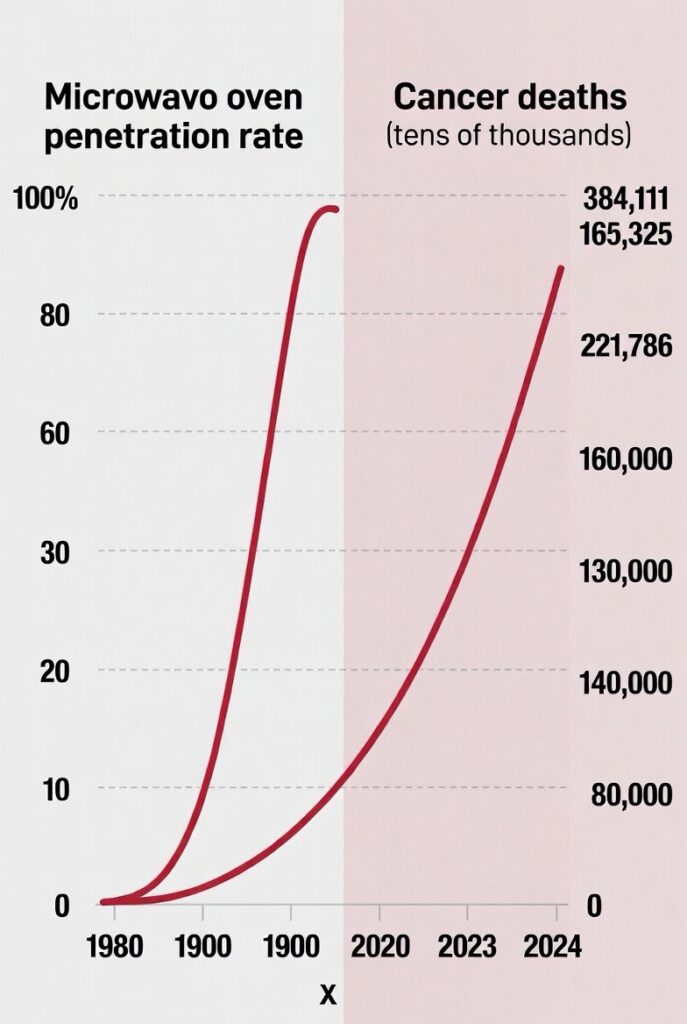 電子レンジの普及が上昇するのに比例して、癌の死亡者数も増加し続けているのがわかります。